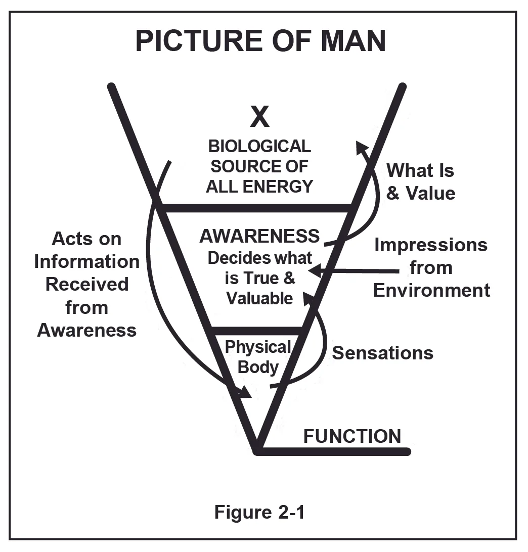 Now X always does the appropriate thing for the information it receives from awareness. Draw a line with an arrow from X to the physical body. X always does the appropriate thing for the information it received and then the appropriate function, of course, takes place into the environment and that cycle is completed. Impression comes into awareness. Awareness has the chores or the attribute or the function of interpreting every sensation, every impression as to its validity of truth and to its value. That is what goes to X. X is the life principal which no one can define. We do know that if it, X, is not present the living form ceases to exist. The body begins to rapidly disintegrate and no function or adaptation takes place. While X is present, if a very hot object should strike the skin there is a sensation which one knows as burn and probably interprets as being painful and dangerous and values getting away from it and X gets away from it and adapts; it will make a blister. If the same hot object is put on a physical structure that X does not inhabit it will start cooking it but it will not form a blister; there is no adaptation. At a later date we will take up some further study on the nature and the way X operates. In the meantime lets leave it without further theories or ideologies. We will try to observe what it does but we will not attribute any attributes other than it always does the appropriate thing for the information received.