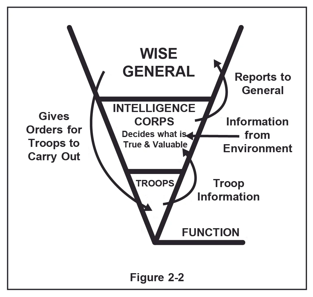 The Intelligence Corps receives information from the environment and from the Troops. The IntelligenceCorps is well aware of what is going on in the Troops, morale, scuttlebutt etc. It is also aware of what is going on in the environment. It does not tell the Wise General what to do but it does relate what it considers to be true as it sees it, the Intelligence Corps, and that it also puts value or priorities on the information. If it feels that it is totally immaterial, puts no value on it, it is not reported. If it is valued it is reported immediately and the Wise General, of course, gives the orders down through his chain of command and the Troops carry out his orders and this aids in the survival and the advancement or the purpose of this organism called an army. It has a general; it has all his lines of command. He depends for his information on the intelligence corps. The function, of course, is to advance and survive for the army.